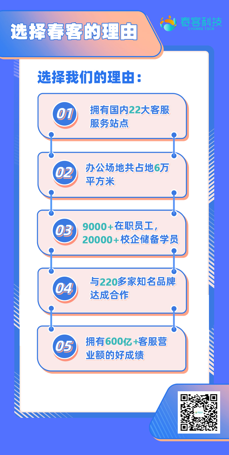 “让生意更简单,让服务更美好”是春客科技不懈的追求。我们将不负信任,贯彻“客户为先,口碑第一”的核心价值观,以客户为中心,为客户创造更大价值!